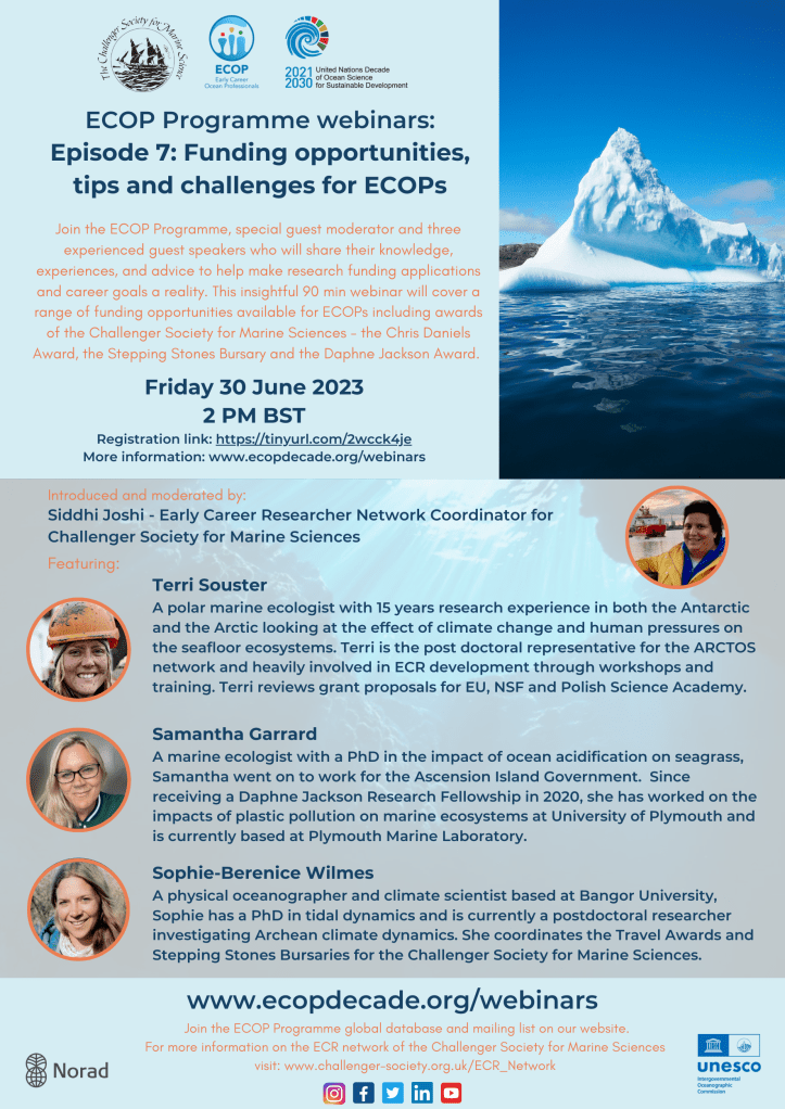 Thanks to partners Early Career Ocean Professionals (ECOP) and the Challenger Society for Marine Science, we are hosting a webinar on funding opportunities, tips and challenges for ECOPs, with special guests & experts.
